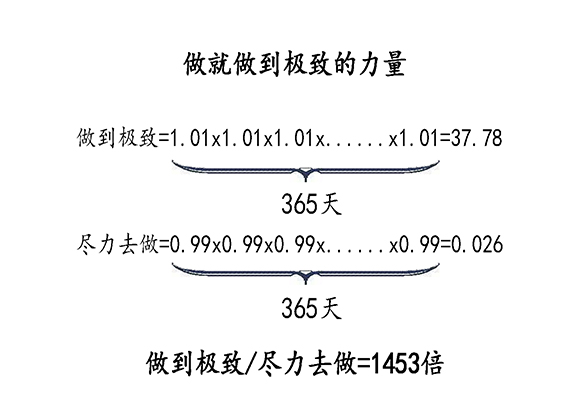 我们倡导员工做任何一件工作,“做,就做到极致”,把事情做细、做专、做到极致,永远以积极的思维方式,满怀热情,付出不亚于任何人的努力,把自己的潜能发挥到极致,人生一定会硕果累累、幸福美满。